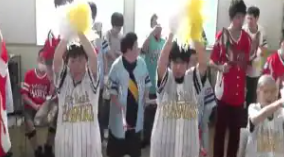 利用者さんたちはユニフォーム姿にポンポンを手に、元気いっぱいに踊り切りました。
