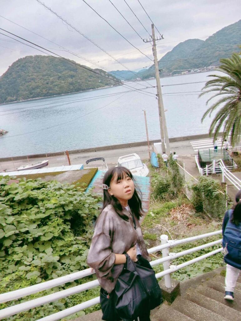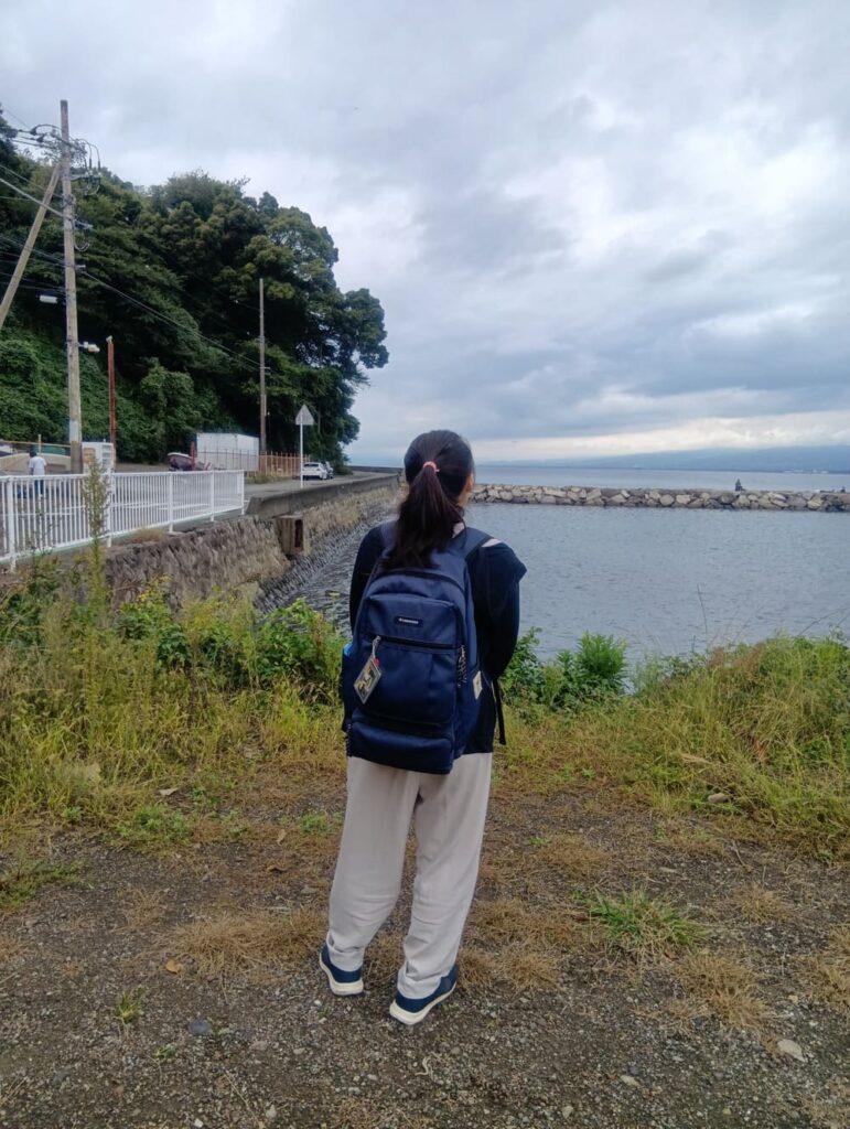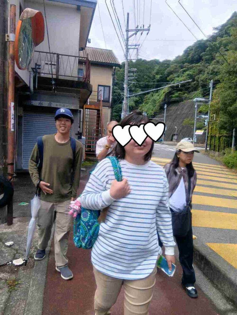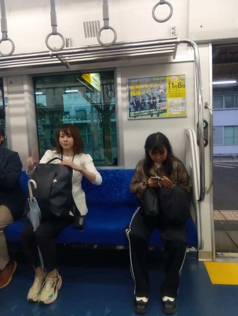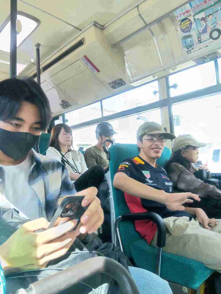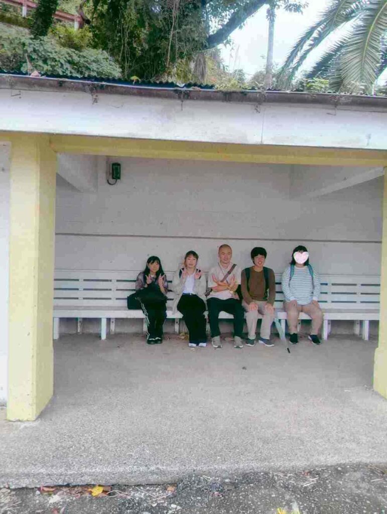 交流会の緊張から解放され、バス停でホッと一息🥰
