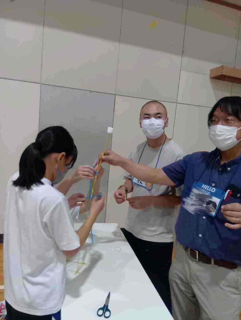 マシュマロタワーは、チームに分かれ、中学生の方達と「どうやったら高くつめるか?」話し合いです