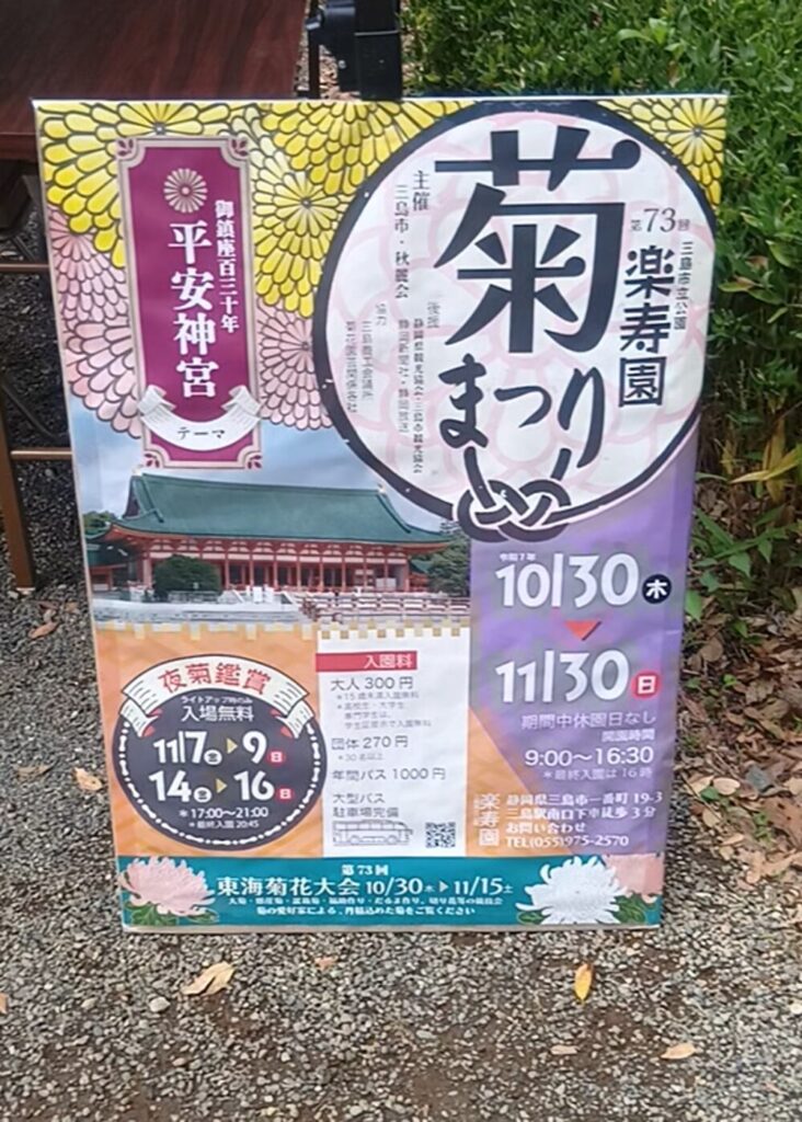 また現在楽寿園では【菊祭り】が行われており、平安神宮を模した建物が