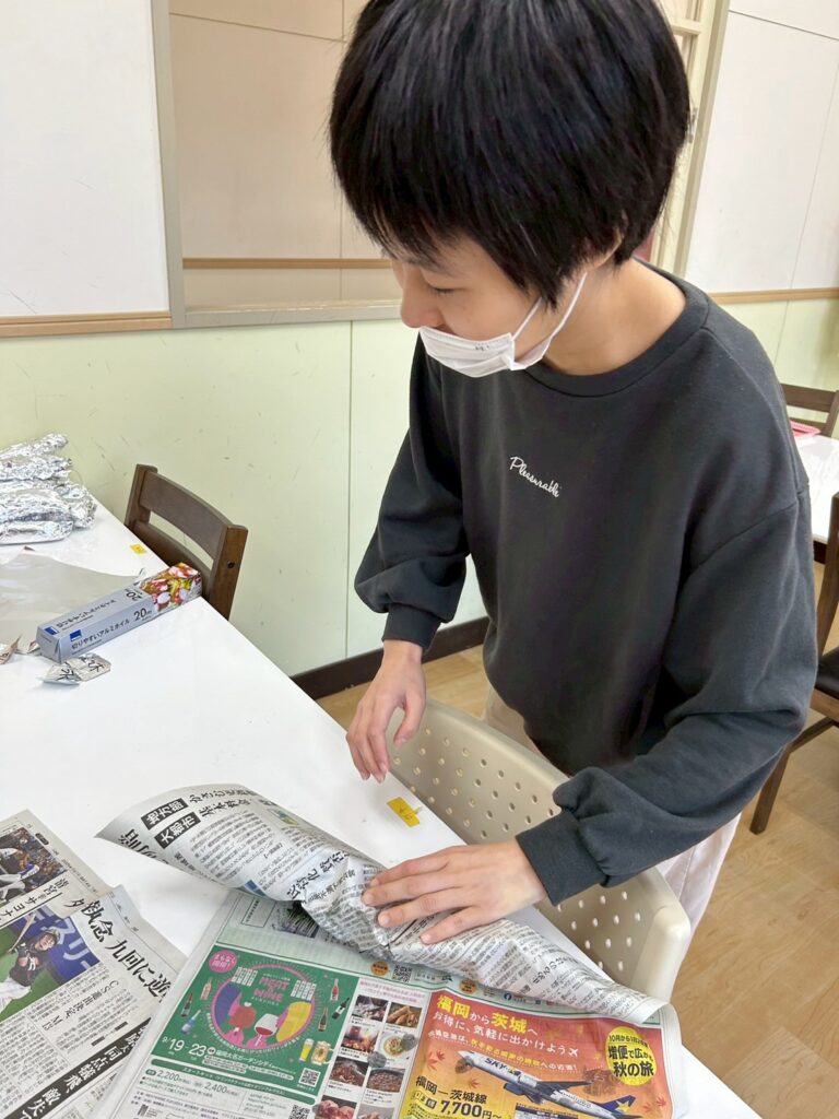 きれいになったお芋を新聞紙でくるくると包み、その上からアルミホイルでしっかりと包みました( •̀ ω •́ )✧