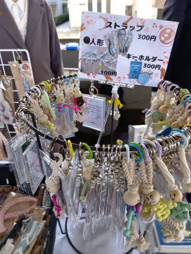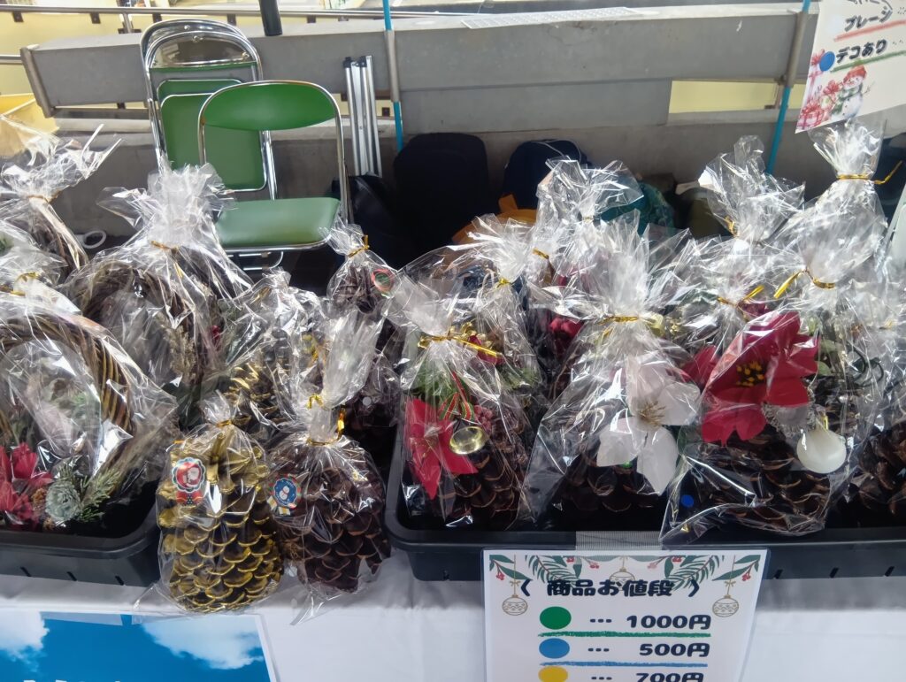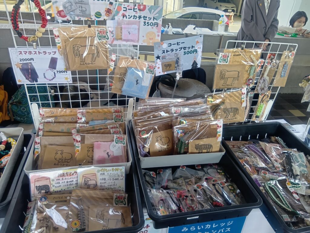 当日は、学生たちが心を込めて作ったクリスマスリースや、福岡・宇美キャンパスから届いたムエタコーヒー、そしてオリジナルのキーホルダーを販売しました。色とりどりのリースや、香り高いコーヒーに足を止めてくださる方も多く、たくさんのお客様にお越しいただきました。