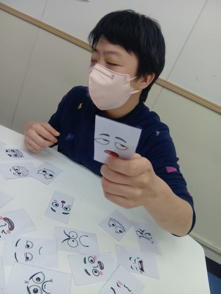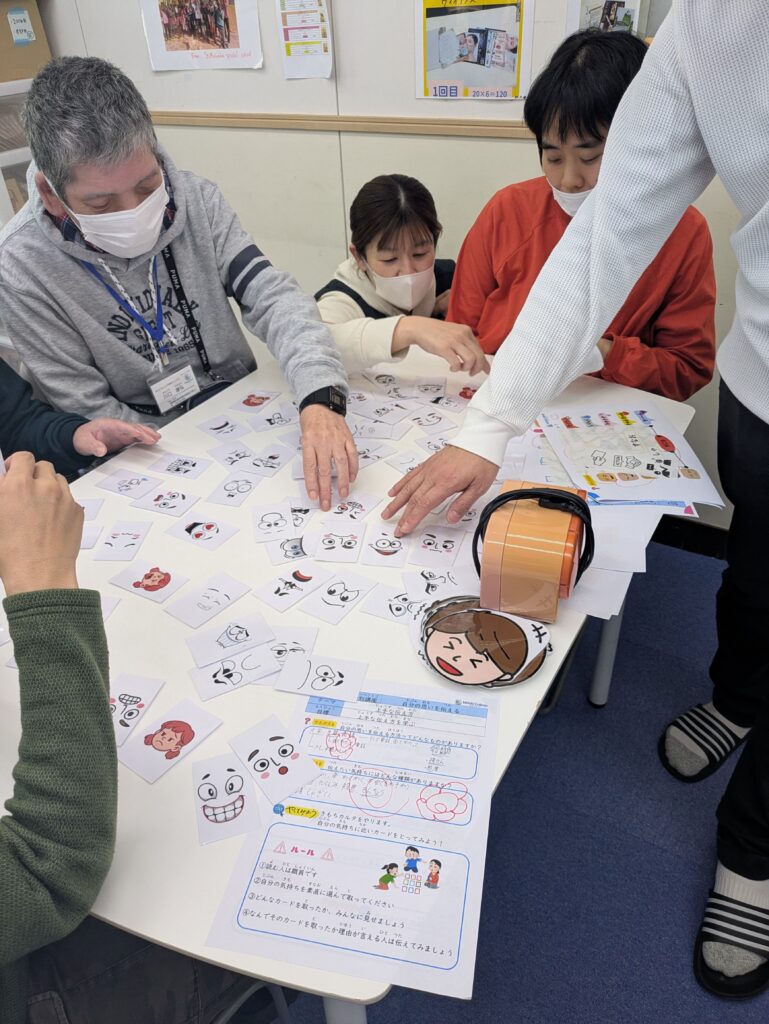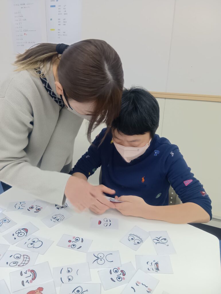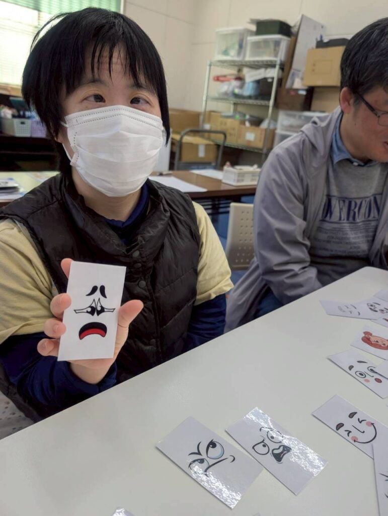 職員がお題を出し、利用者さんは自分の気持ちに近い表情のカードを選びます。