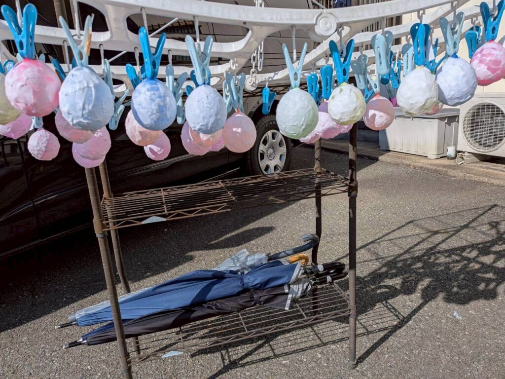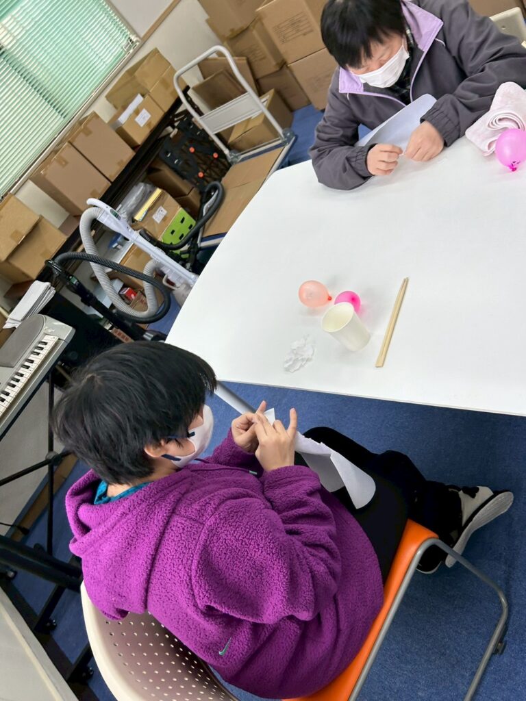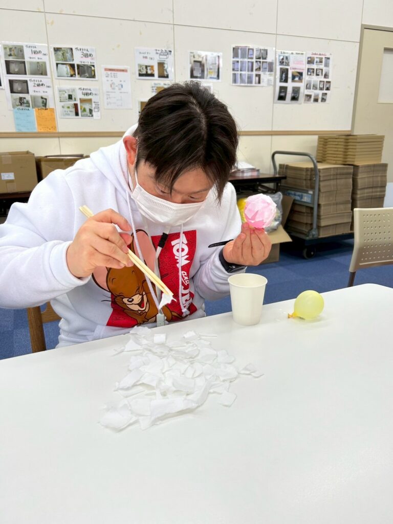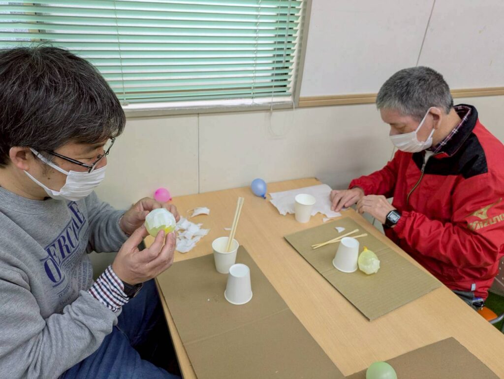 水風船をふくらませ、和紙を細かくちぎり、薄めたボンドを使ってペタペタと貼り付けていきました 🎈🖐️