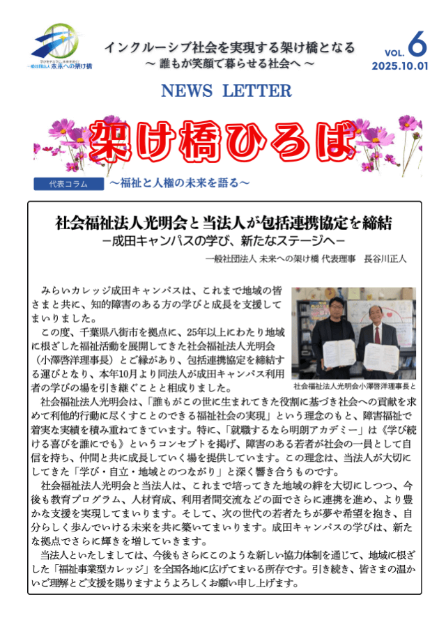 一般社団法人未来への架け橋は、その理念として「インクルーシブ社会を実現する架け橋となる」を掲げ、福祉の新たな価値を創造し、すべての人々が幸せを追求できる社会を目指しています。